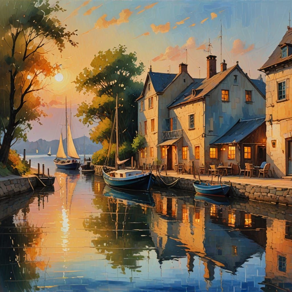 This image shows a sailing boat moored near a tavern in the warm, golden light of a peaceful evening. Rendered with soft brushstrokes and vibrant colors, it captures gentle ripples and reflections on the water.