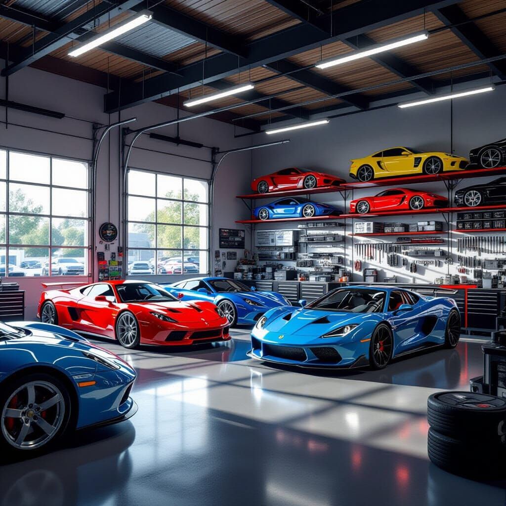 This image shows a detailed garage filled with sports cars and organized tools. The scene is lit to showcase every detail with a hyper-realistic, cinematic aesthetic reminiscent of concept art.