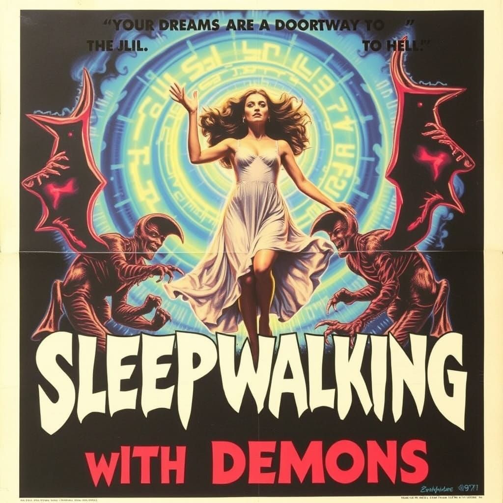 A vintage-style horror film poster from 1971 depicting a woman levitating in a trance surrounded by demons. The poster features swirling neon patterns and a grainy film effect reminiscent of grindhouse exploitation films.
