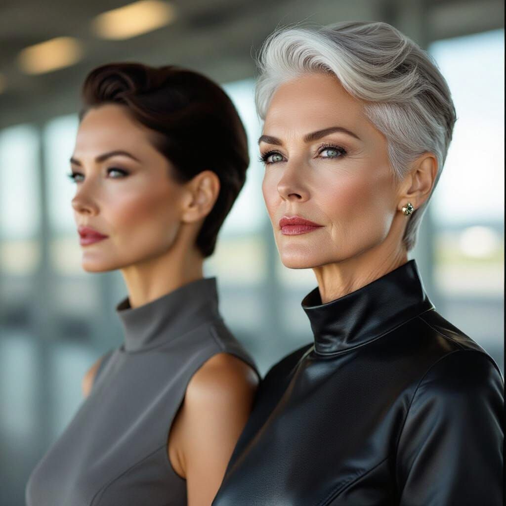 This image captures two stern, elderly women in a fashion photography style. Dramatic lighting highlights their severe expressions and sophisticated attire, evoking a polished, severe aesthetic.