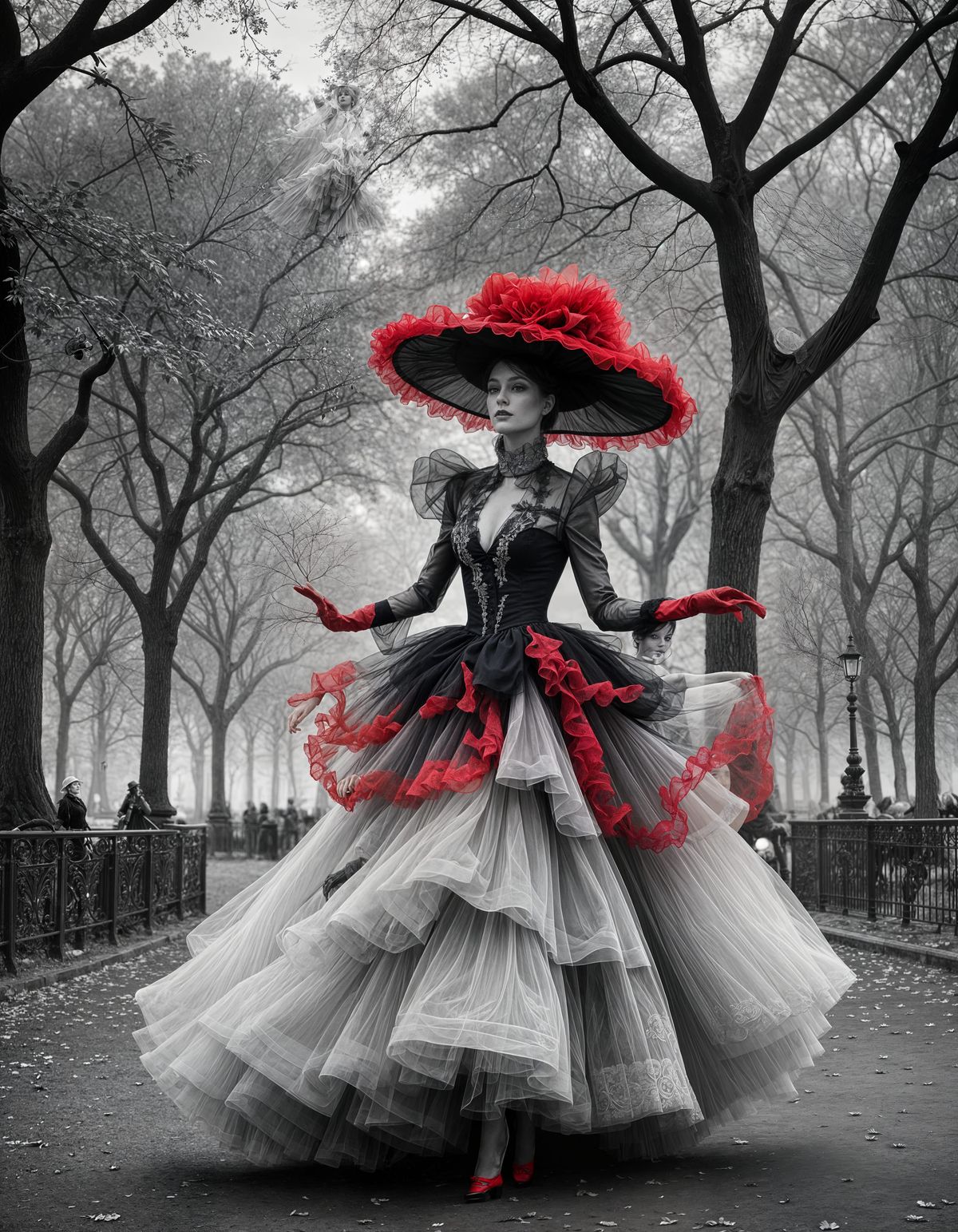 This image shows an elegant model in a wide-brimmed tulle hat and rococo dress dancing in a Paris park. The black and white haute couture photograph features a red color splash.