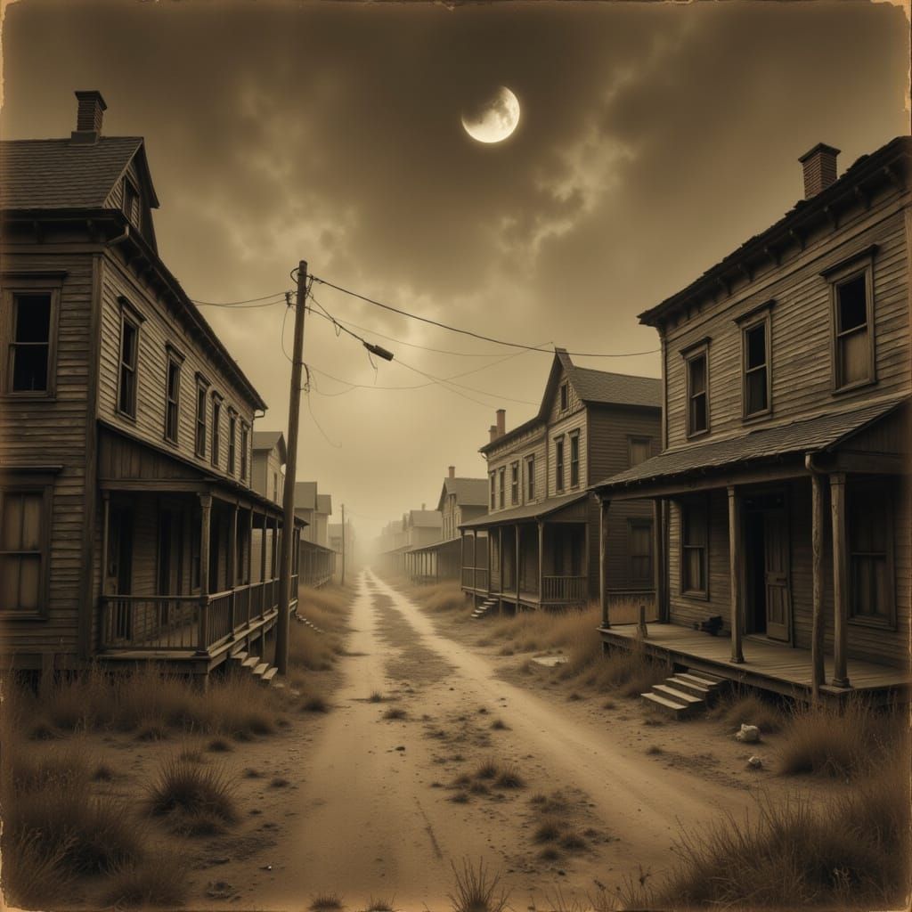 This image depicts a silent, desolate ghost town under a crescent moon. Dust swirls through streets of weathered buildings, creating a hauntingly beautiful, sepia-toned landscape with atmospheric lighting and a palpable sense of decay.