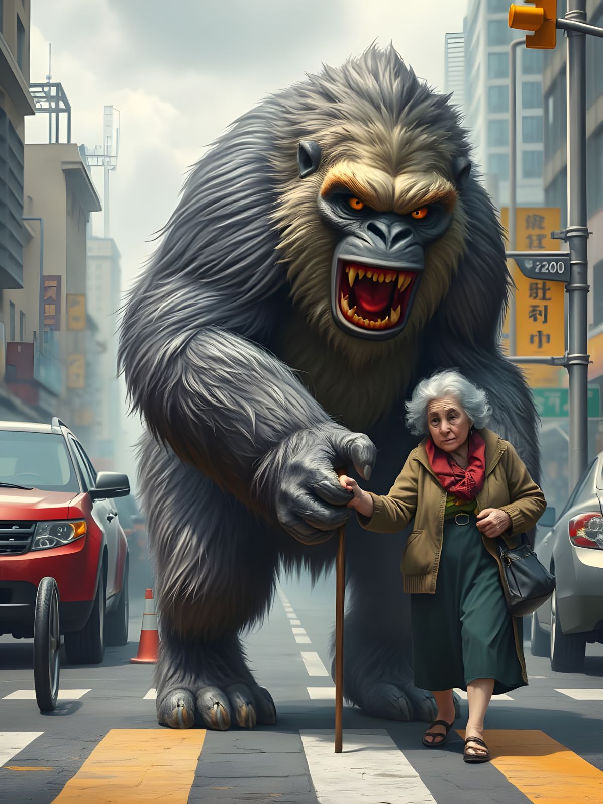 This image shows a massive, ferocious-looking yeti gently guiding an elderly woman with a walking stick across a bustling street. The artwork is meticulously detailed and hyperrealistic.
