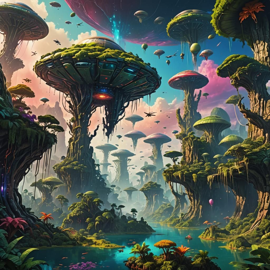 This image shows an alien world with floating islands and lush jungles. Alien creatures resembling pterosaurs soar through the vibrant sky in this detailed and colorful concept art.
