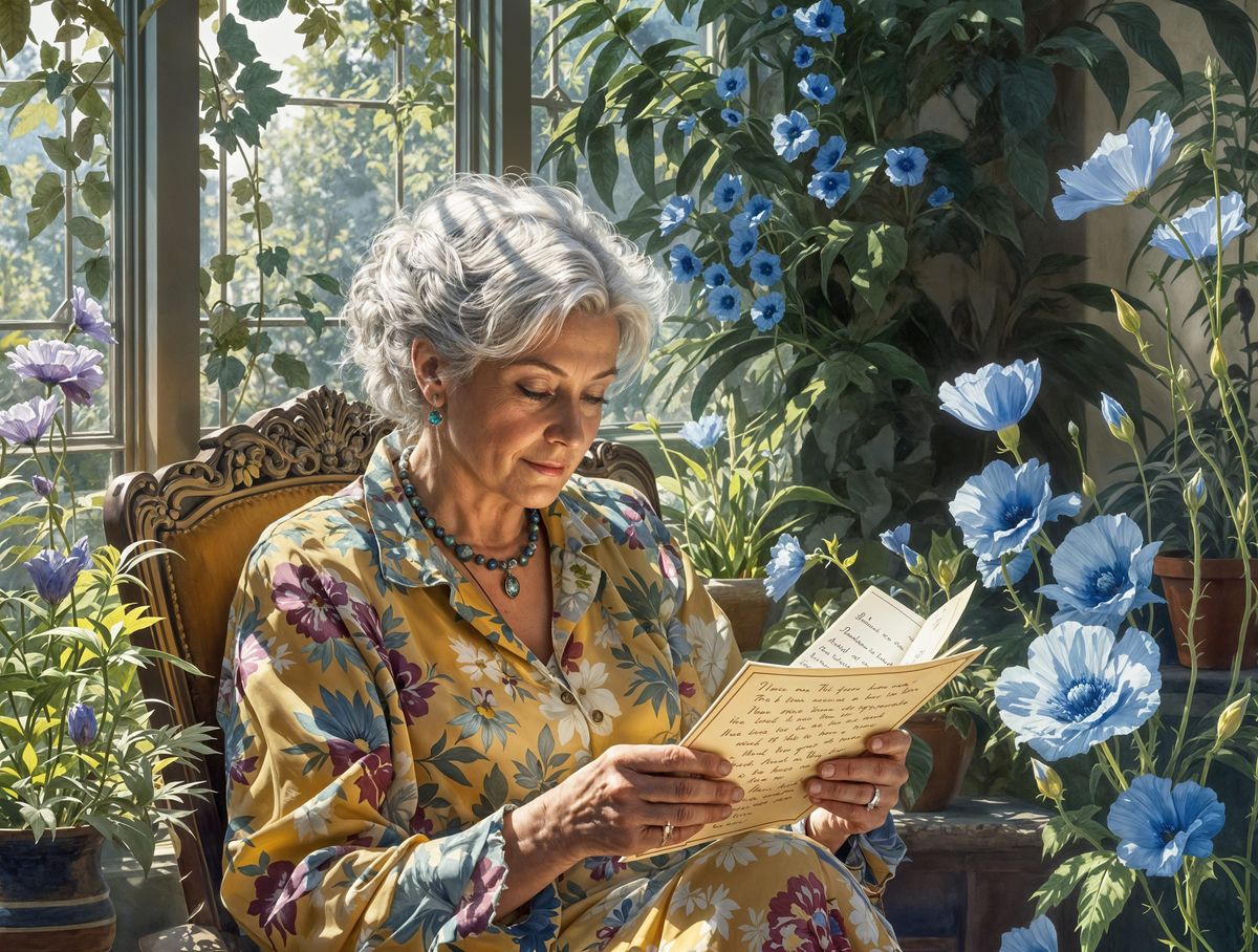 A serene digital painting of a woman lost in thought amidst a lush conservatory, surrounded by rare blue poppies and vintage elements, evoking a deep, bittersweet atmosphere.