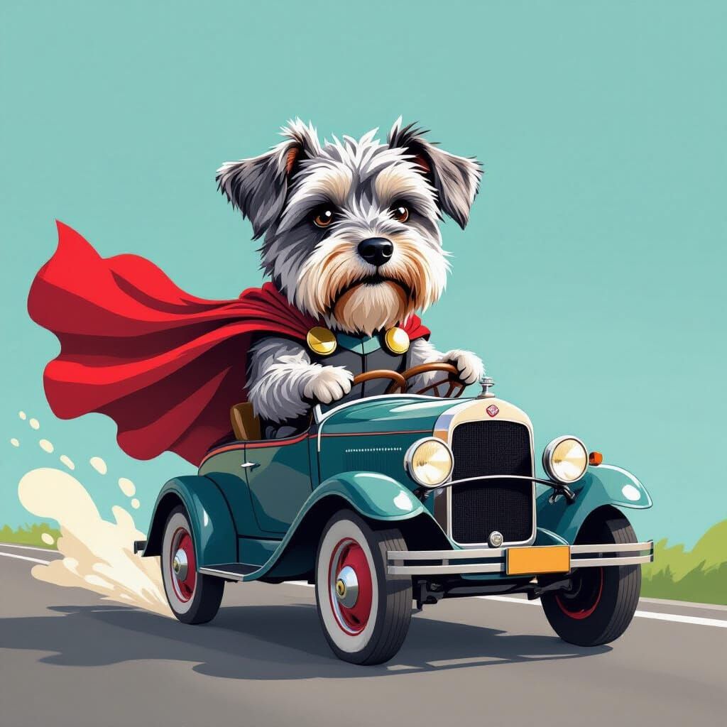 This image shows a playful graphic caricature of a dog dressed as Thor, driving a car shaped like a bowler hat. The scene features vibrant colors and soft lighting against a minimalist background.