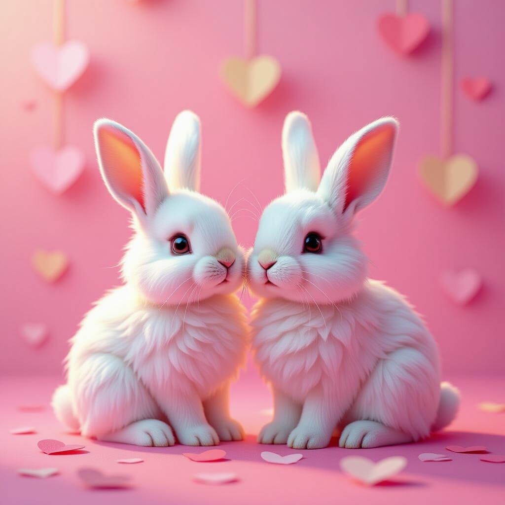 This image features two charming rabbits with soft, cotton-like fur against a romantic pink background with paper hearts. It has a vibrant pastel harmony and a fairytale aura, in a stylized pop-surrealism aesthetic.