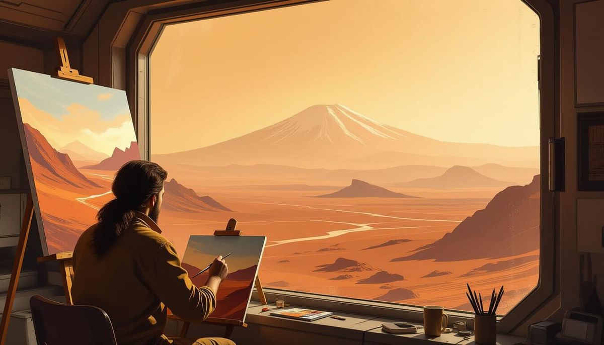 This atmospheric realism image shows an artist painting Mars' vast ochre deserts and Olympus Mons from a colony habitat, rendered with vintage film grain.