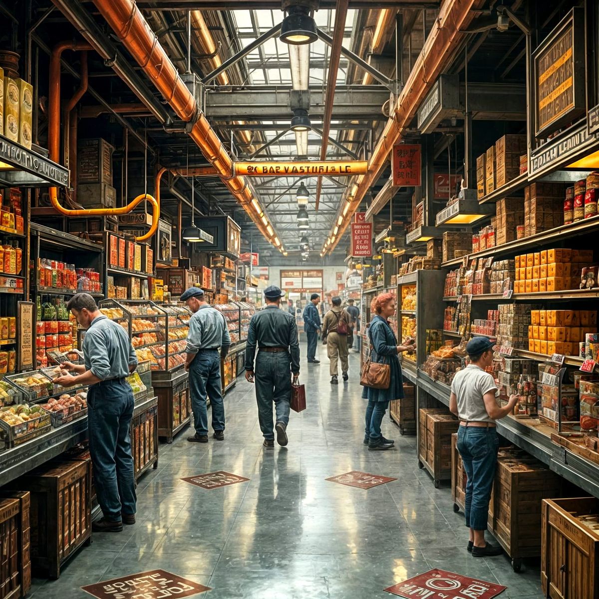 This image depicts a bustling 1940s diesel punk supermarket, showcasing shoppers in a unique blend of industrial and vintage styles.