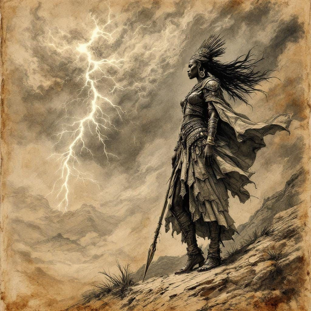 A striking picture of an African warrior queen in ceremonial battle attire, rendered as a Renaissance-style charcoal sketch on aged parchment. The drawing emphasizes texture and evokes strength.