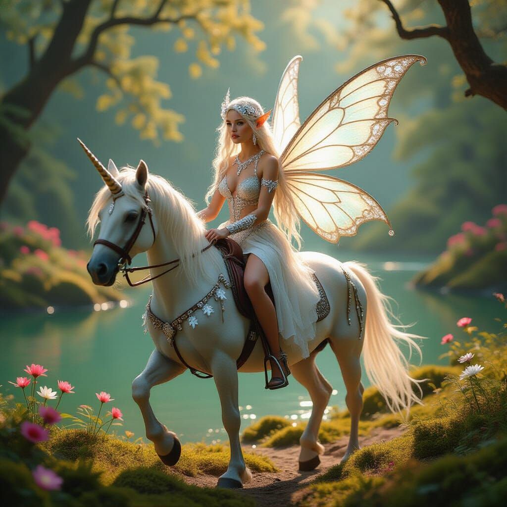 A cinematic film still shot on a v-raptor XL with film grain and a vignette. The image has a cinematic lighting and is in 35mm film. The photograph has a high contrast and is post-processed. The photo is of a fairy riding a unicorn in a bright mossy forest by a lake. The fairy has soft glowing skin, ...