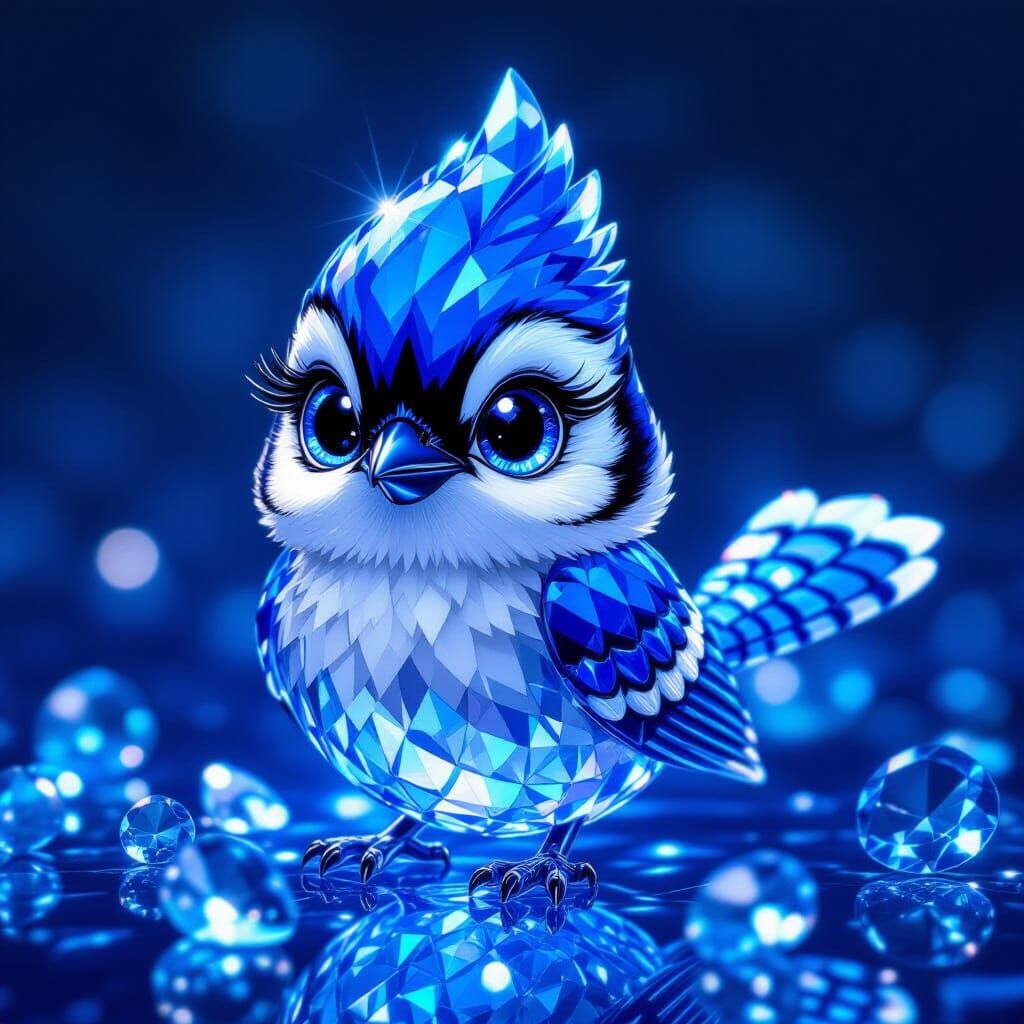 This image depicts a whimsical chibi blue jay crafted entirely from luminous sapphire crystal. It features intricate gemstone details, big shiny eyes, and an ethereal glow, resembling a frozen fractal sculpture.