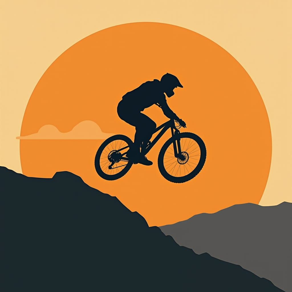 A dynamic silhouette of a mountain biker jumping downhill. The image features a striking two-color palette and clean vector graphics, reminiscent of modern graphic design.