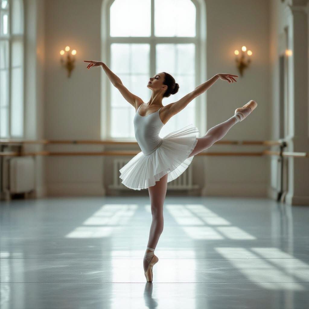 She balances on a breath of light, poised between gravity and grace. The studio, bathed in morning glow, becomes her silent witness. Each limb extends like a whispered verse, every muscle a note in the symphony of motion. In white, she is purity and discipline incarnate, an ephemeral sculpture of strength and elegance, carved not from marble, but from devotion, repetition, and the poetry of dance.