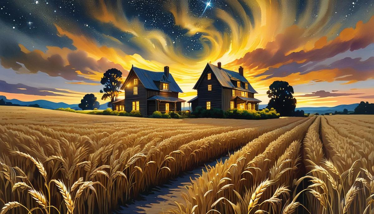 A dreamy scene of a wheat field under a starlit sky, featuring a quaint three-story house and winding path. Rendered with thick textures and bold colors in an expressionistic style.