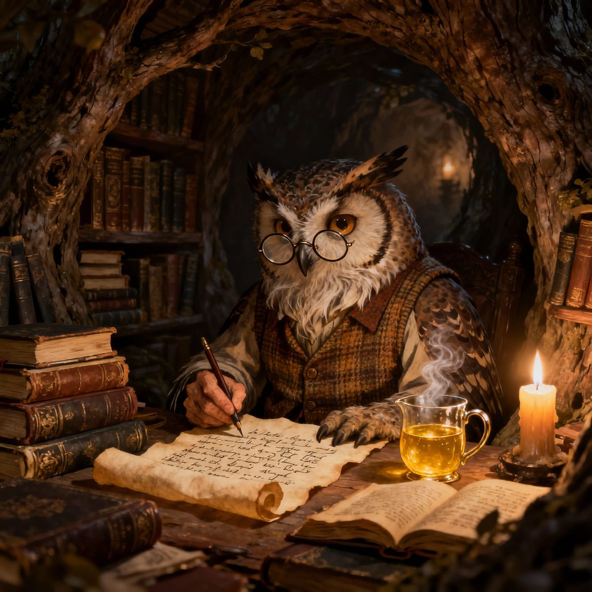 A wise old owl, wearing a tiny spectacles and a tweed vest, is engrossed in writing a complex poem on a scroll by candlelight. He sits in a cozy, book-lined study within a hollow tree, surrounded by stacks of ancient tomes and a steaming mug of nectar. The style is hyper-detailed, dark fantasy illustration ...