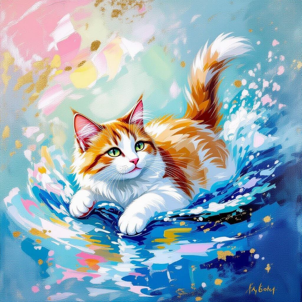 This image depicts a cat swimming, rendered in a unique style blending Rococo, Impressionist, and Romantic art. It features fluid brushstrokes in white, pink, blue, and yellow with shimmering gold accents.