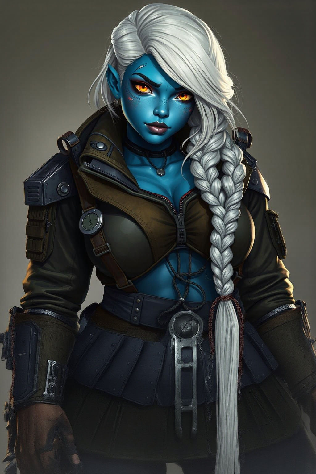A full body portrait of a Pantoran female pilot with vibrant blue skin and glowing golden eyes, dressed in a worn pilot's jacket. Rendered in a detailed, matte-painted style with deep, complementary colors.