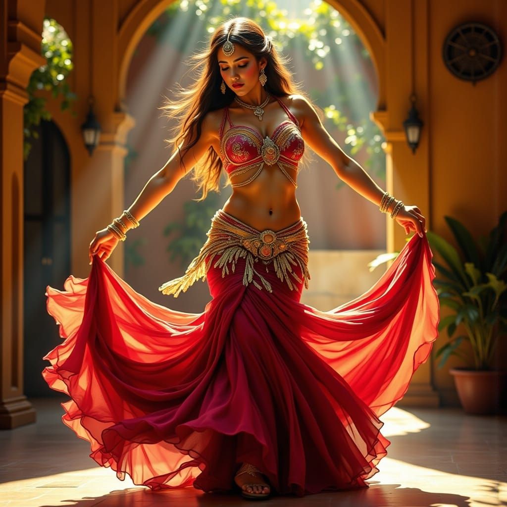 A solo belly dancer performing in a courtyard, their body captured mid-motion in fluid, graceful poses. The dancer wears silk and satin costume adorned with shimmering veils, intricate beadwork, and jingling coin belts that catch the light with every movement. Rich, ruby, sapphire, and gold—flow around them, accentuating their elegant gestures. The overall atmosphere radiates energy, elegance, and the captivating spirit of bellydance.