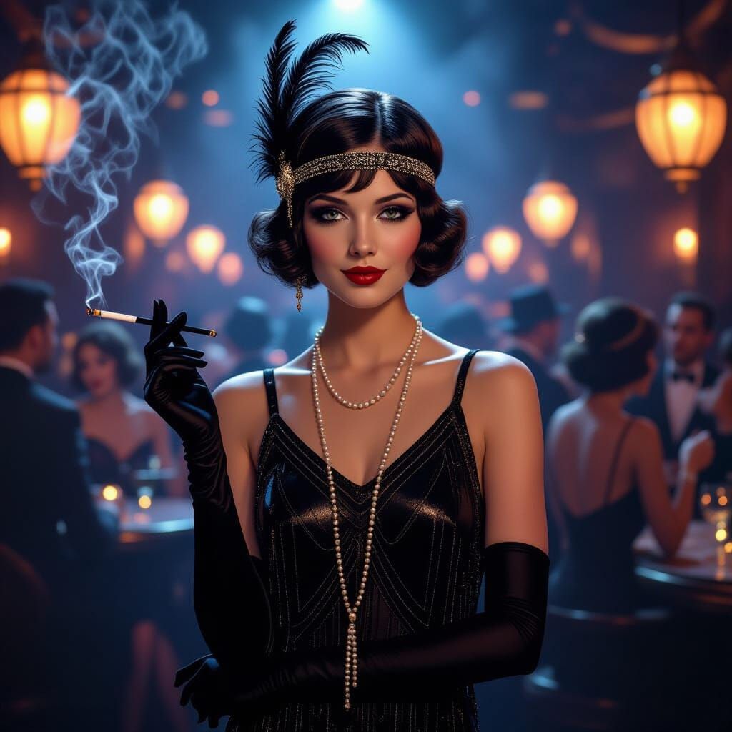 A black and white photograph capturing a young woman in a flapper dress standing in a bustling 1920s jazz club. Her dark bobbed hair is adorned with a feathered headband, and she holds a long cigarette holder with a lit cigarette. The club is dimly lit with art deco lamps and smoke hanging in the air, ...