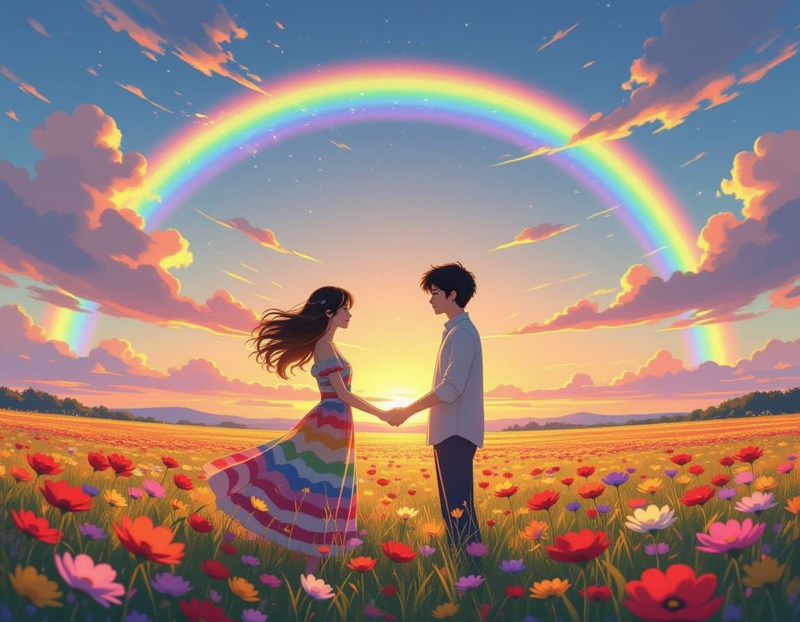 A loving couple admires a vibrant field of flowers under a full-spectrum rainbow sky. The woman's hair blows in the wind while the man holds her hand. Rendered in a painterly, magical realism style.