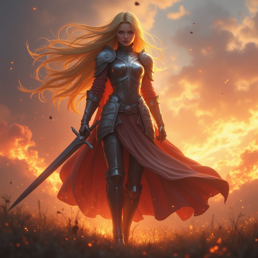 A striking anime knight with flowing blonde hair stands on a fiery battlefield. Rendered as detailed fantasy concept art with deep, complementary colors and intricate detail.