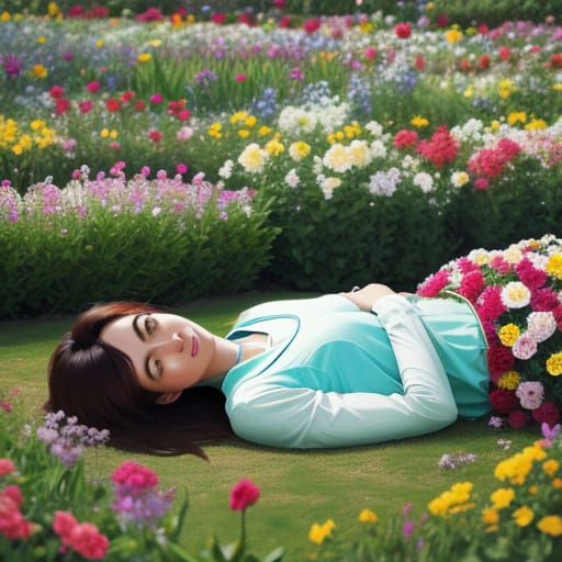 This image depicts a woman peacefully resting amidst a colorful and lush flower garden, capturing a serene moment of natural beauty.