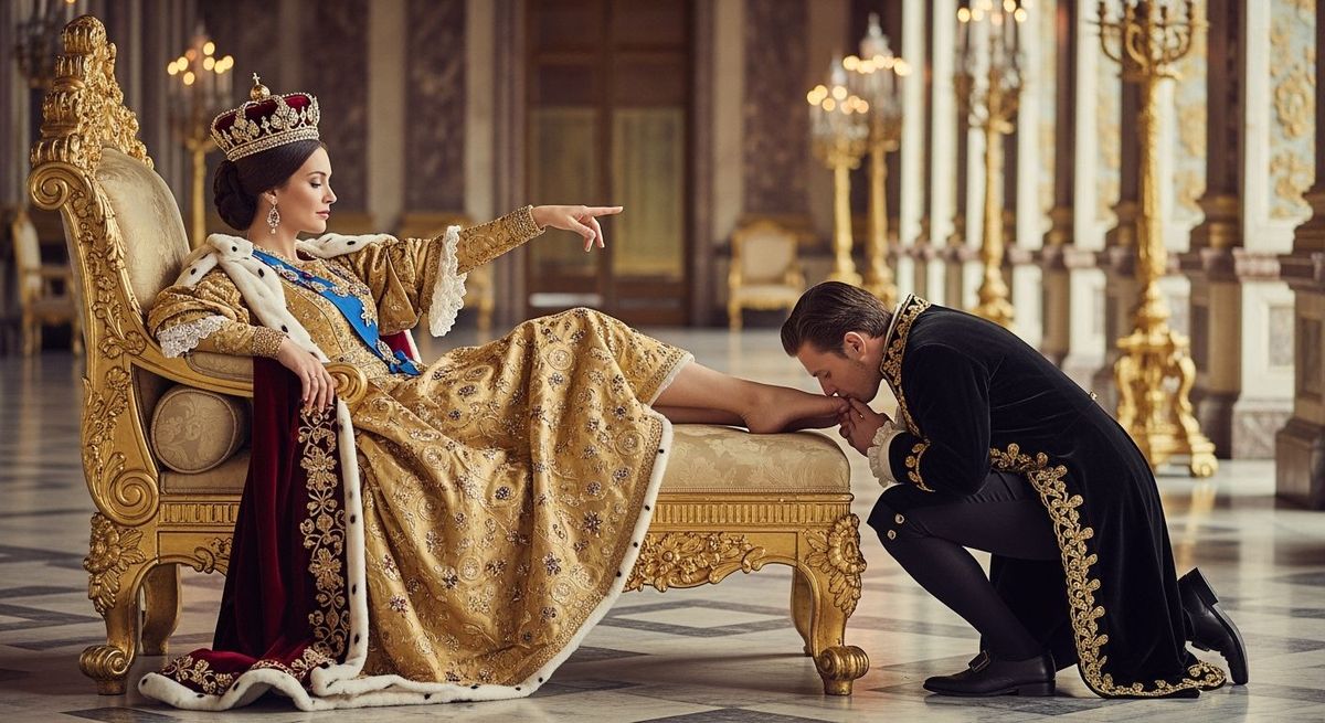 This image shows a French Empress in coronation robes lounging on a chaise longue while a courtier kisses her feet. The scene is set in a Versailles-inspired palace, captured as professional photography with natural light and shallow depth of field.