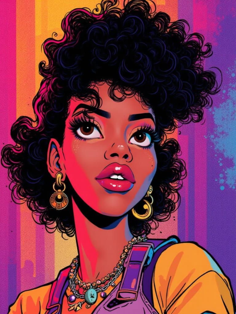 <lora:Limma:1.0> line drawn cartoon, quirky and detailed design, clean lines, vibrant colors, wide range of textures, intricate, storytelling, 90s science fiction anime in the style of cowboy bebop, moebius, done as graphic novel art, using complementary color palette. A depiction of an emotive character ...