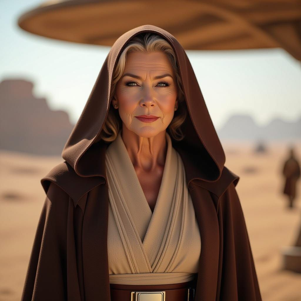 Cinematic film still of Helen Mirren portraying Obi-Wan Kenobi on Tatooine. Features film grain, vignette, and dramatic lighting for an epic, atmospheric feel.