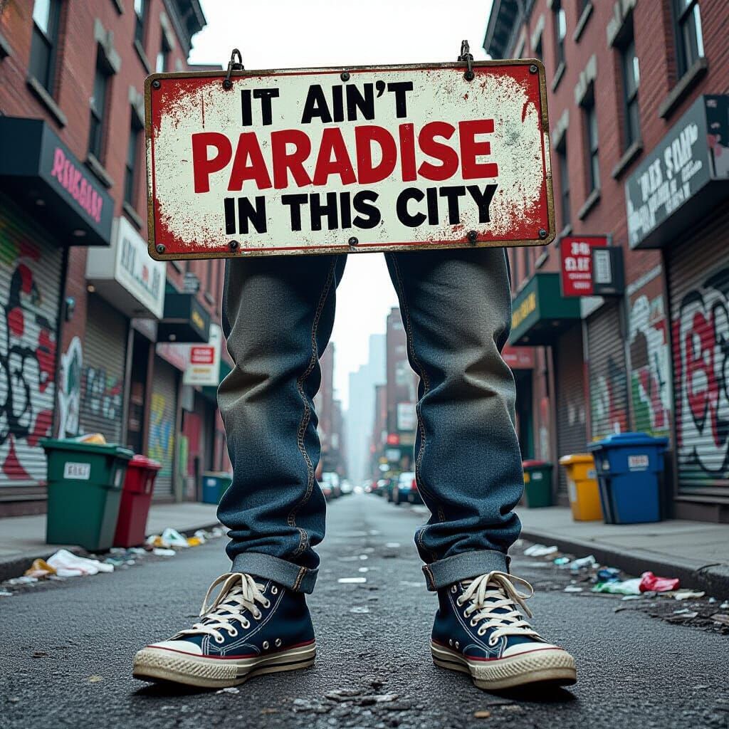This image shows a dystopian urban scene with worn sneakers and faded jeans on dirty streets. Graffiti-tagged signs and crumbling buildings create a gritty, decaying atmosphere as 3d rendered digital art.