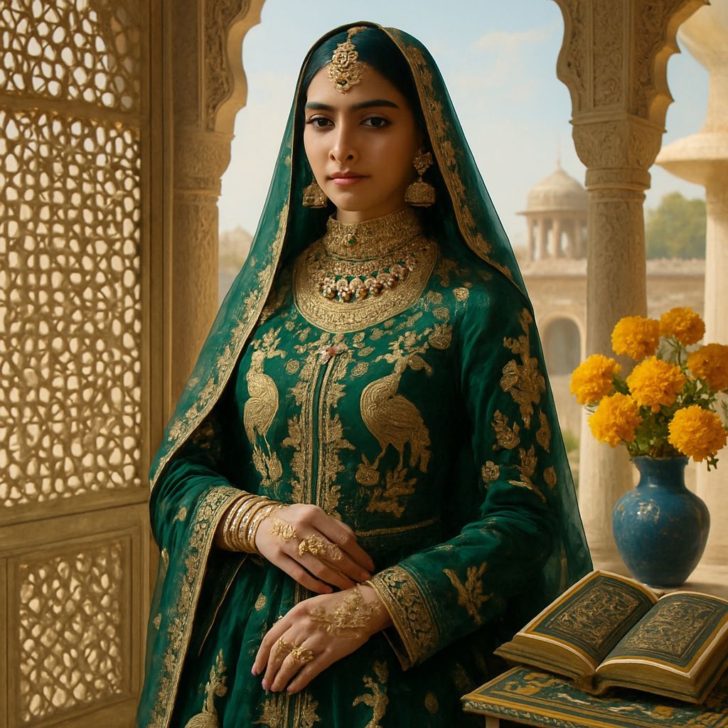 This image shows a regal woman in traditional Mughal attire on a palace balcony. She is adorned with emerald velvet, intricate gold embroidery, and exquisite jewelry, standing in a sunlit jharokha.