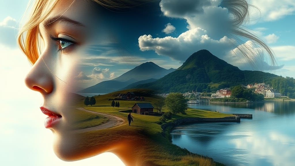 This image shows a double exposure portrait of a woman merging with a landscape. The scene includes a lake, children playing, villages, and a distant city, all rendered as a detailed digital painting with cinematic lighting.