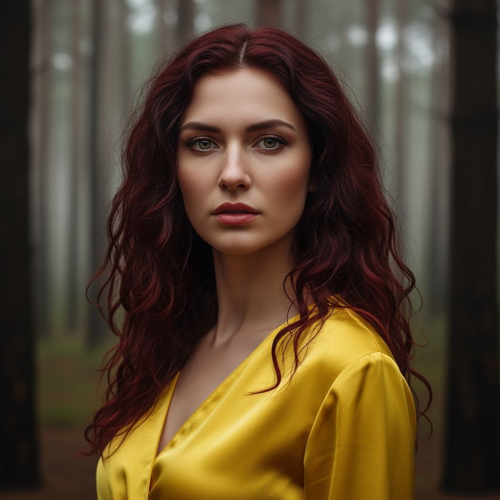 This image shows a sporty woman with long, dark red curly hair and striking eyes, wearing a yellow silk dress. The portrait, reminiscent of art nouveau, is set in a misty pine forest, using realistic, photorealistic techniques and soft, natural lighting.