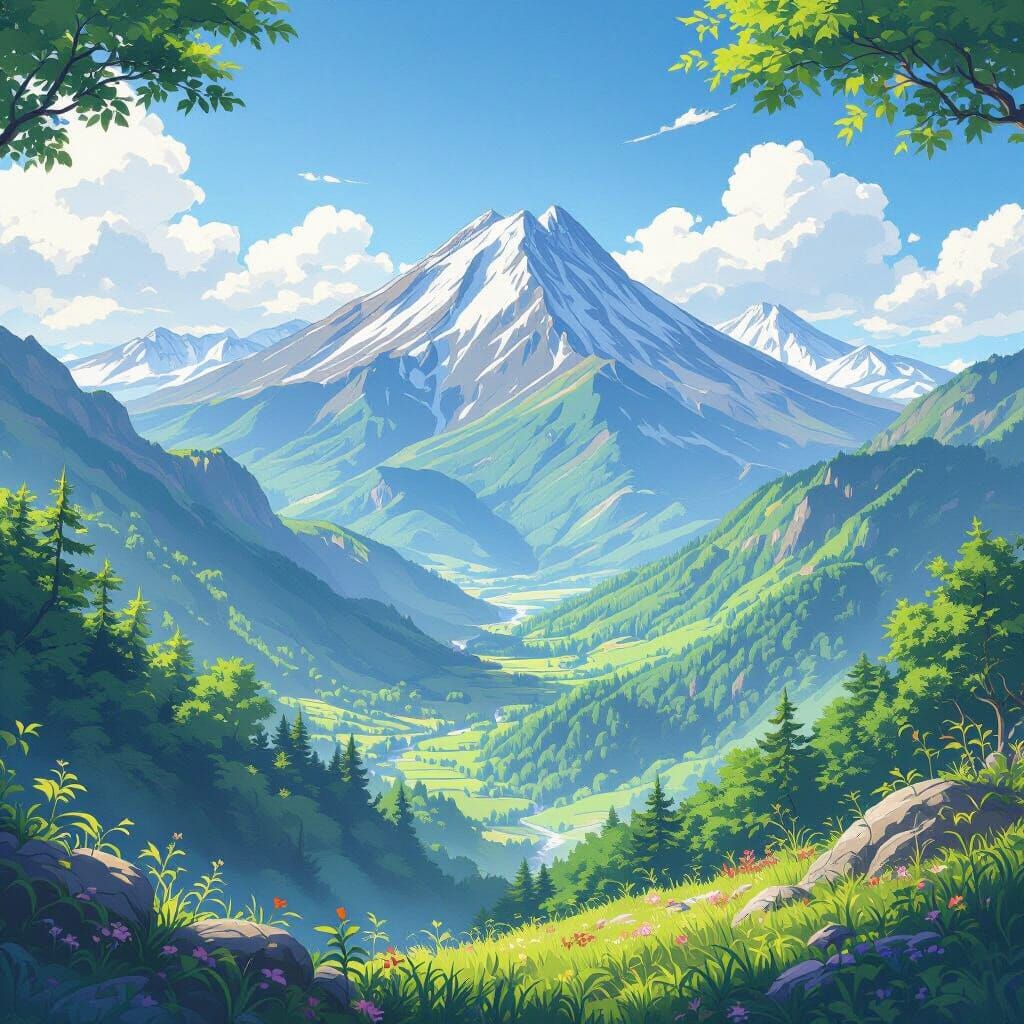 This image shows a vibrant anime-style landscape featuring majestic mountains and lush forests beneath a clear blue sky. Soft, painterly shading and atmospheric lighting create a serene atmosphere.