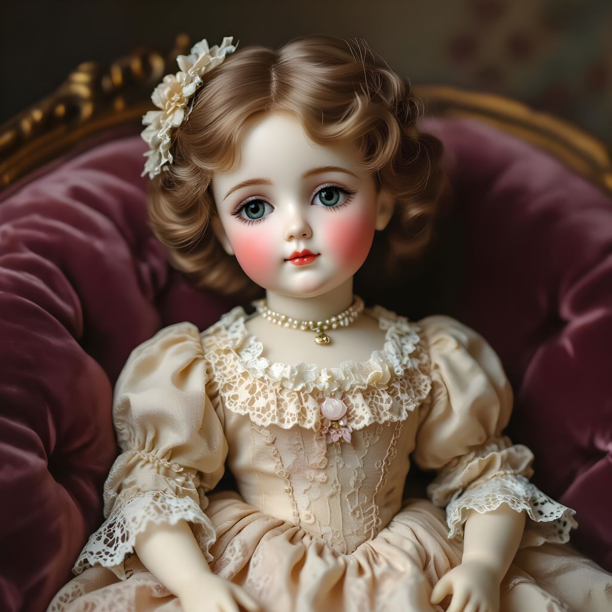 This image features a delicate porcelain doll, capturing its intricate details and classic aesthetic. A charming representation of a collectible toy.