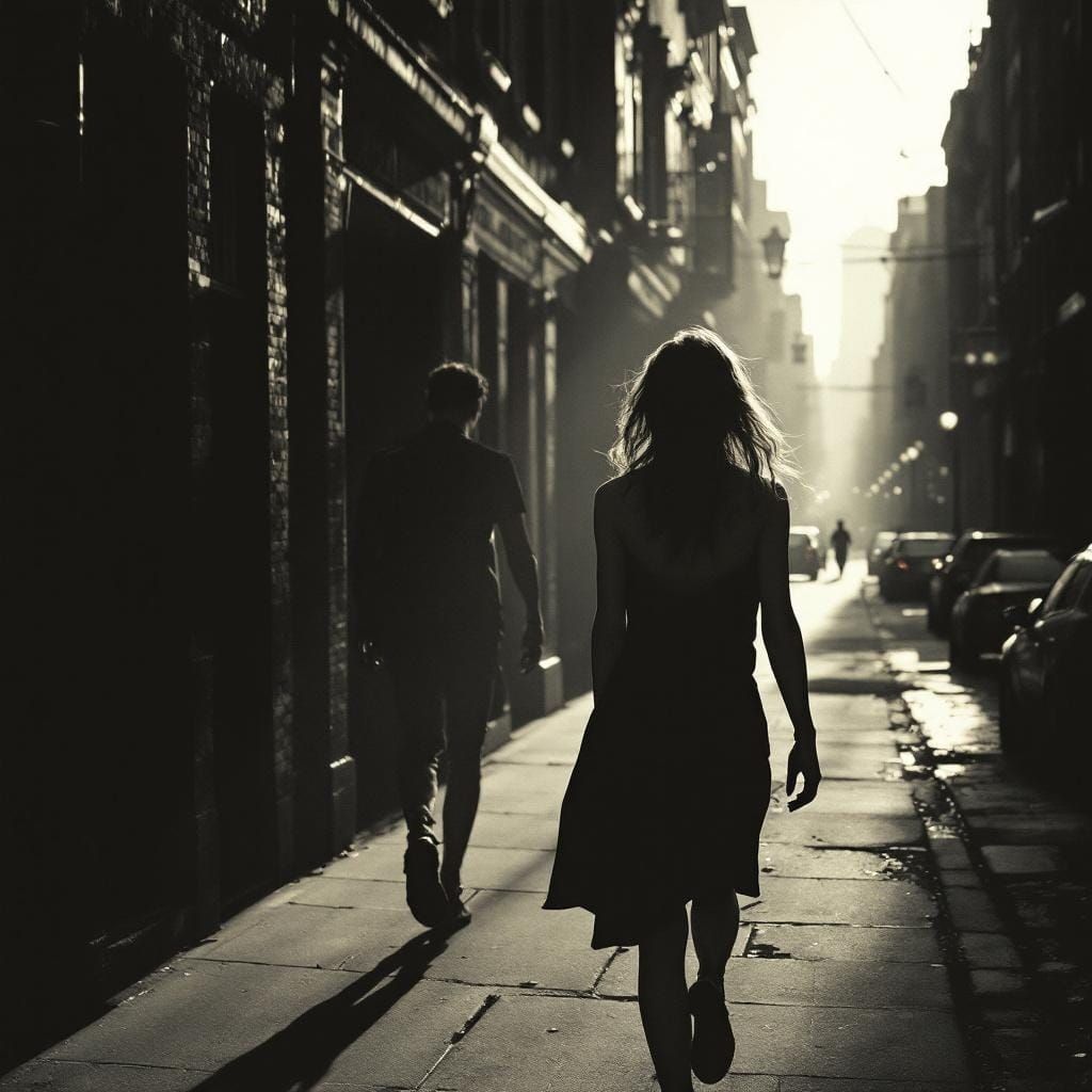 This image shows a woman walking down a city street in a film noir style. The selective color and high contrast lighting create an intense and dramatic atmosphere in a cinematic style.