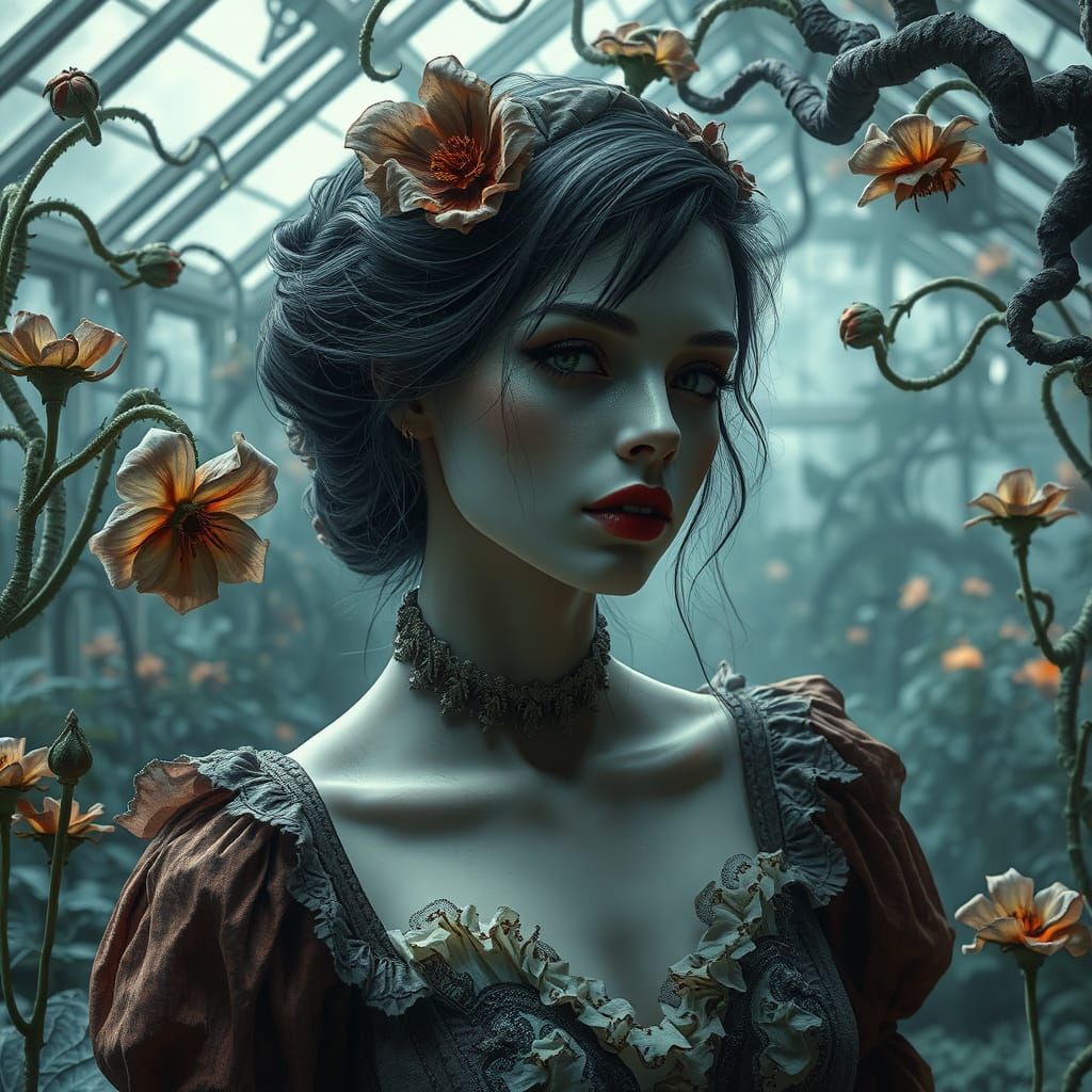 This image shows a woman in Victorian clothing in an eerie garden. The scene features body horror elements and glowing flora in a forgotten greenhouse. The image is stylized with triadic colors.