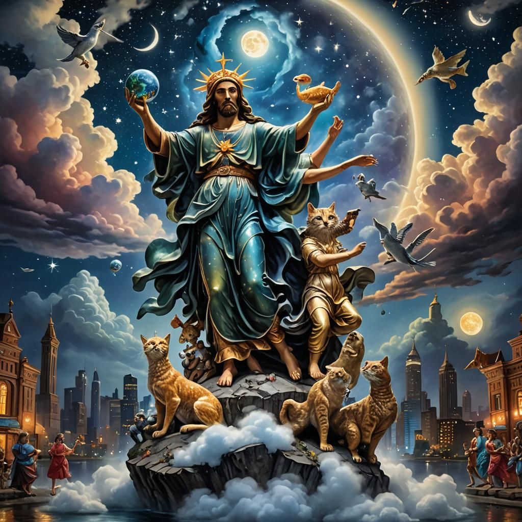 A vibrant matte painting of three glass dancer figurines at night. A large Jesus statue floats on a cloud behind them. One figurine depicts a hawk eating a cat. Rendered as fantasy concept art with triadic colors.