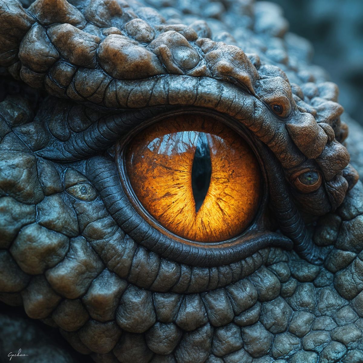 A close-up fantasy painting focusing on a dragon's eye. This image captures the intricate details and mythical essence of the dragon, rendered in a painterly style.