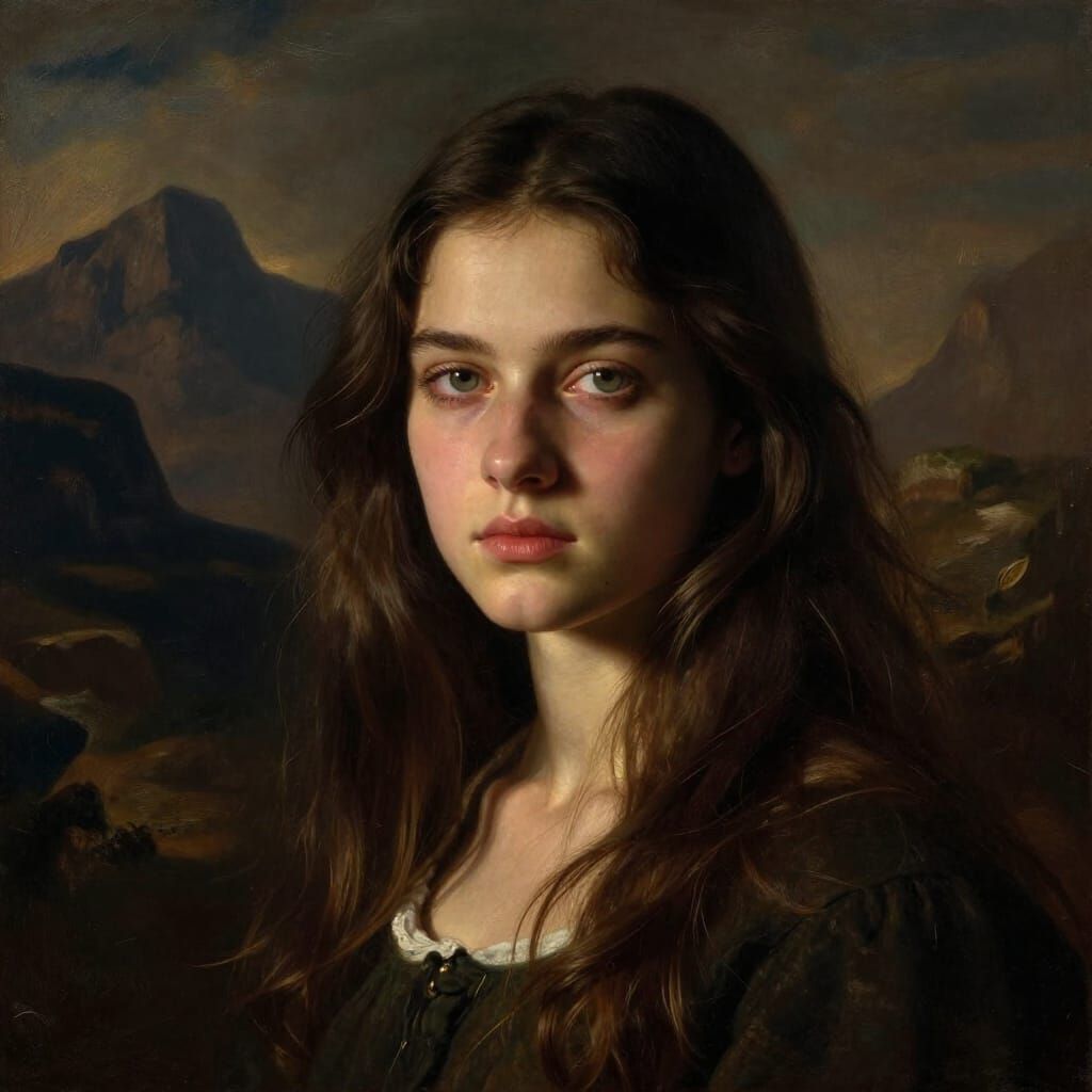 This image showcases a striking portrait of an 18-year-old woman with dark hair and determined eyes. The artwork features dramatic chiaroscuro lighting and a mysterious landscape, rendered in a Romanticism style with rich texture.