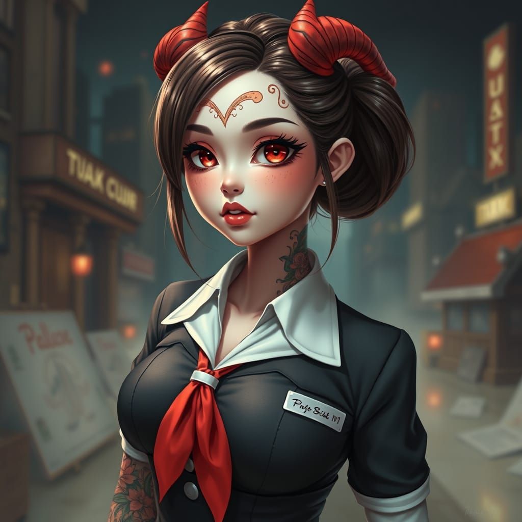 A striking picture of a kawaii pinup character with demon oni features and crimson tattoos, conservatively dressed. The image blends vibrant colors with intricate details in a surreal, reality-bending setting, as 3D rendered digital art.