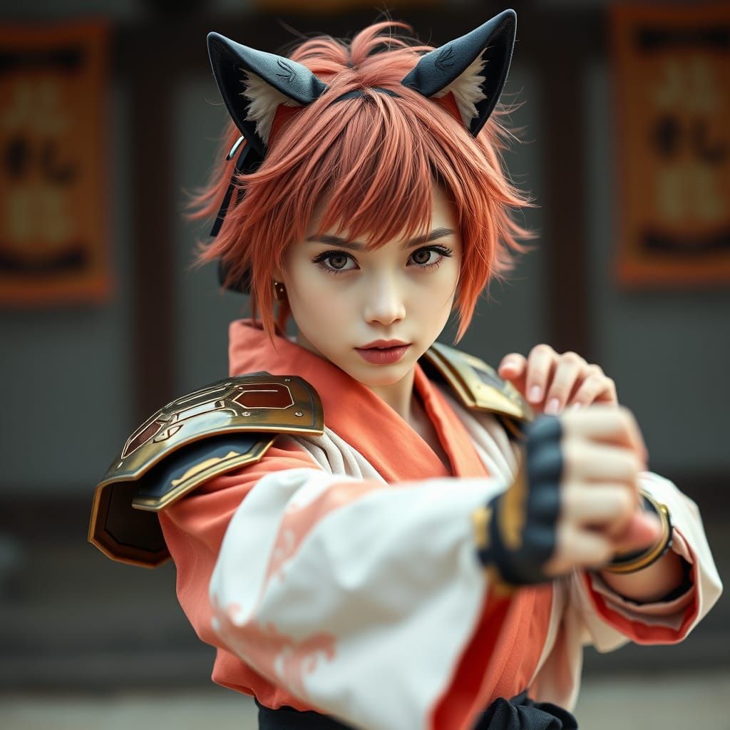 A young woman in a powerful karate fighting pose, with dark blue cat ears and a vibrant coral kimono, set against a dramatic, film-like background with subtle grain and vignette.