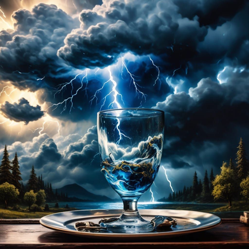 A close-up of a surreal, stormy scene with electric blue lightning bolts and turbulent clouds, rendered in a vibrant oil painting aesthetic with dramatic golden lighting and incredibly detailed textures.