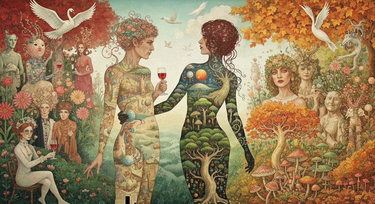 This image depicts a surreal garden party with guests in elaborate costumes, amidst towering flowers and whimsical sculptures. The scene blends fantasy and surrealism with vibrant colors and intricate details.