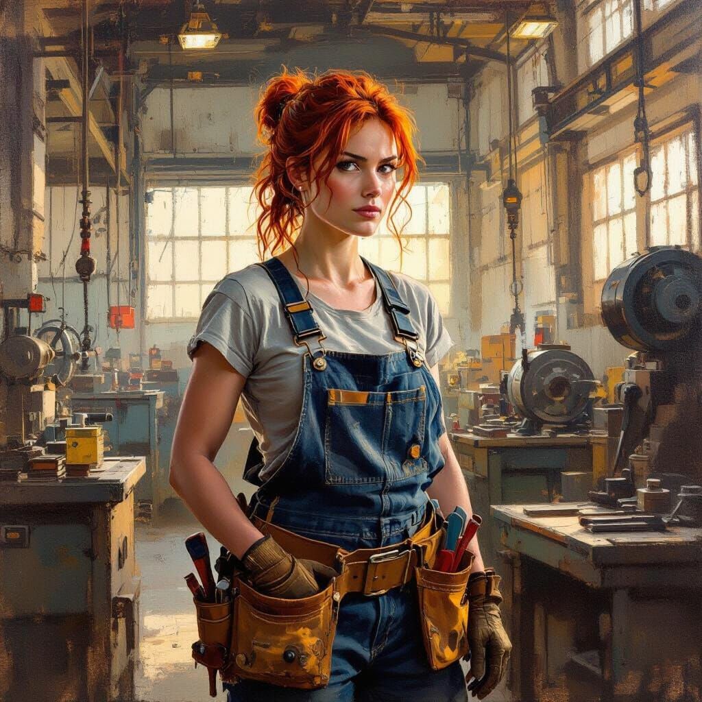 A determined female maintenance supervisor in a busy workshop, bathed in golden hour light. Captured with textured brushstrokes and dramatic lighting, evoking a sense of industrious resilience.