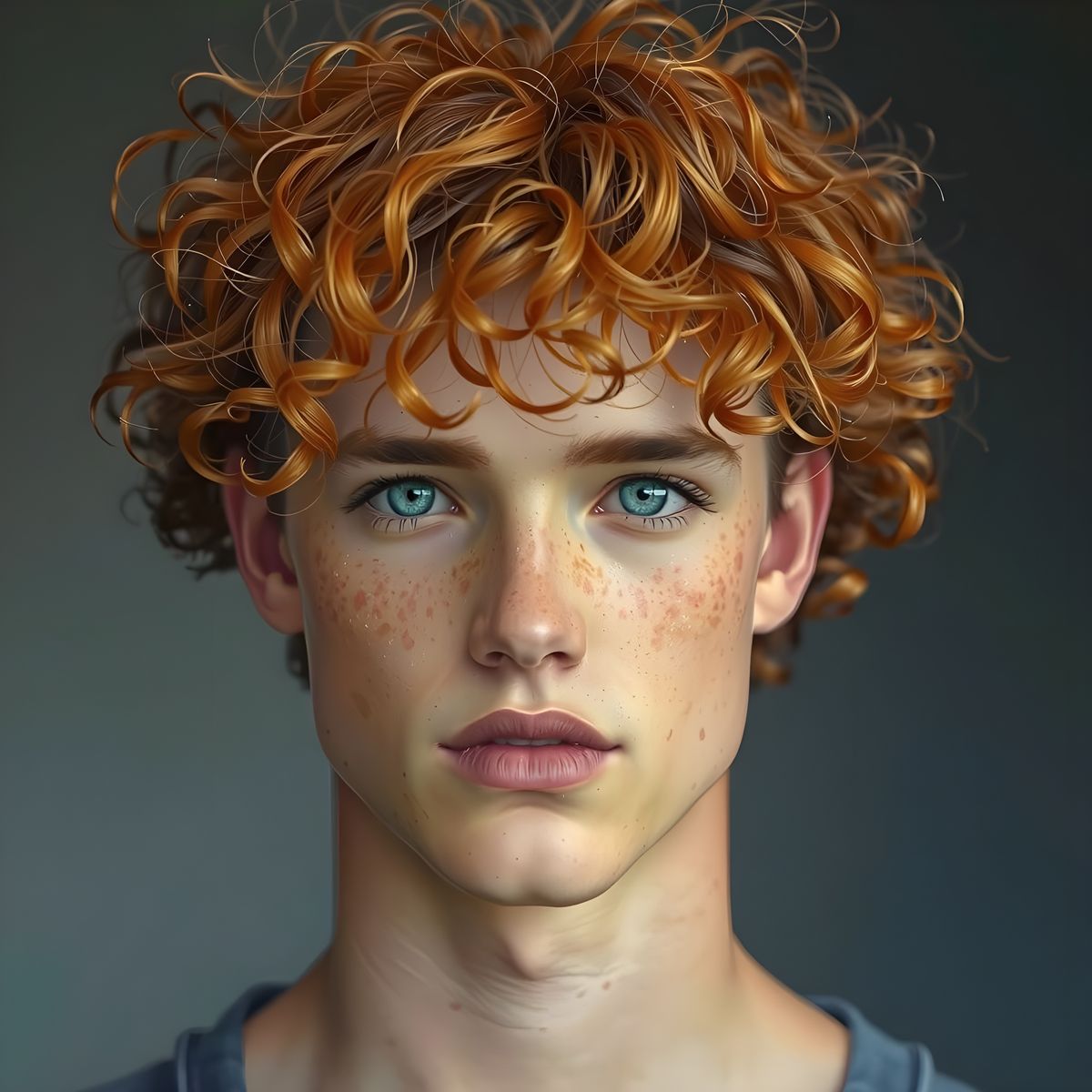 This image shows a portrait of a young man with red curly hair and blue eyes. Soft light highlights his freckled face against a muted background, creating a serene and ethereal digital artwork.