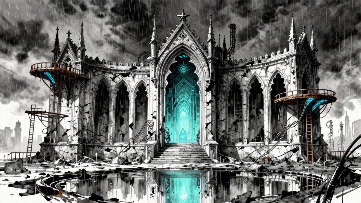 This image depicts a decaying gothic building in stark black and white, featuring intricate arches and towers, with cyberpunk elements and glowing turquoise lights. Rain streaks across a stormy sky, reflecting in a pool.