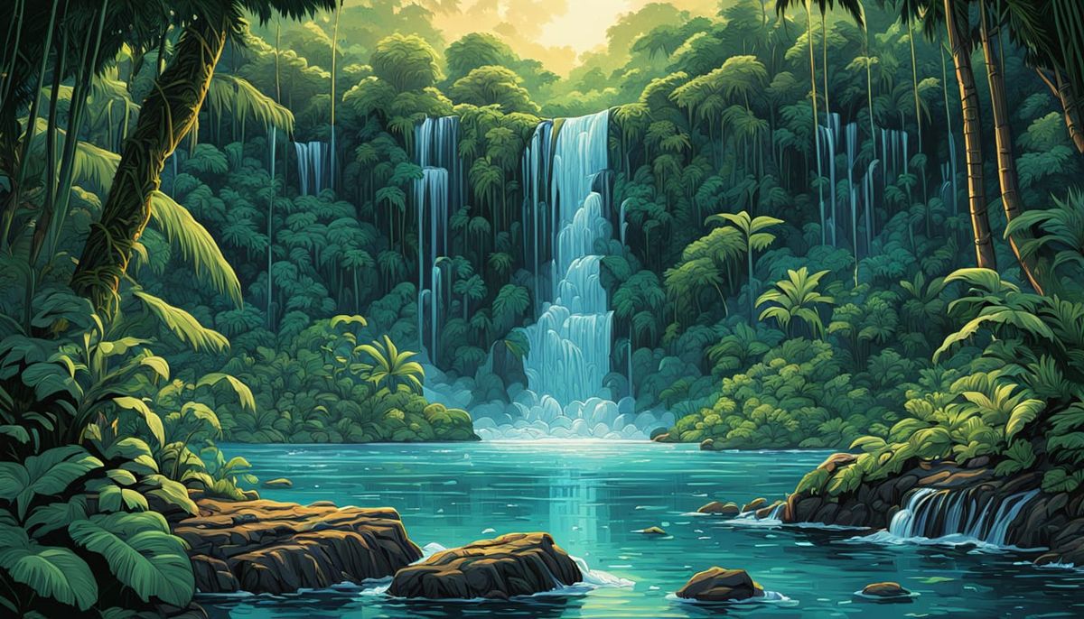 A vibrant comic book style image of a blue lagoon with a waterfall. The scene is filled with lush, tropical foliage, sparkling water, and soft, golden light.