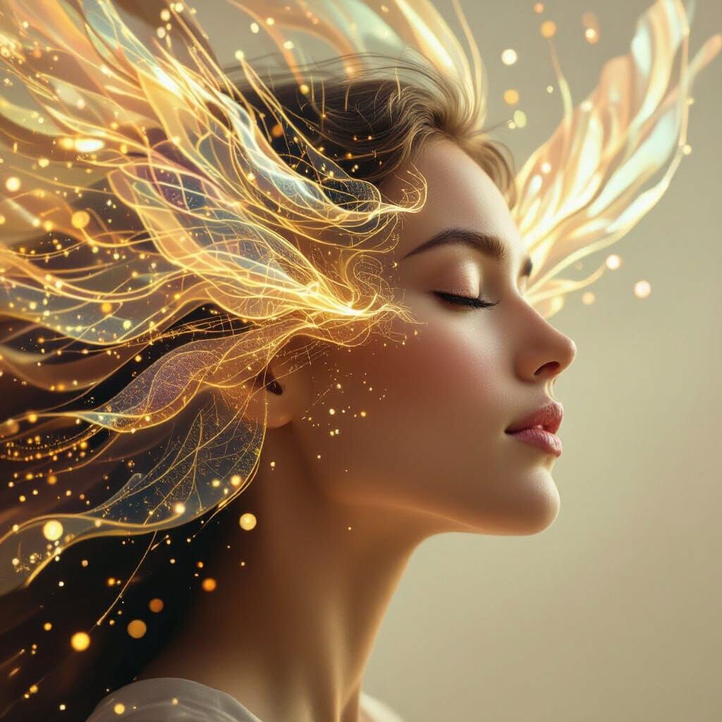 This image depicts a woman's face with eyes closed, dissolving into translucent wings of swirling wind and luminous energy particles in gold and amber. It captures serene power and spiritual flight in a surreal digital matte painting style.